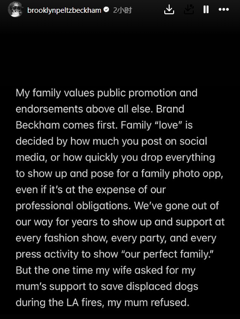 我的家人把公开宣传和商业代言看得高于一切。“贝克汉姆品牌” 才是第一位的。所谓的家庭 “爱”,取决于你在社交媒体上发多少内容,或者你能多快放下一切去参加家庭拍照作秀 —— 哪怕这会牺牲我们的工作安排。
